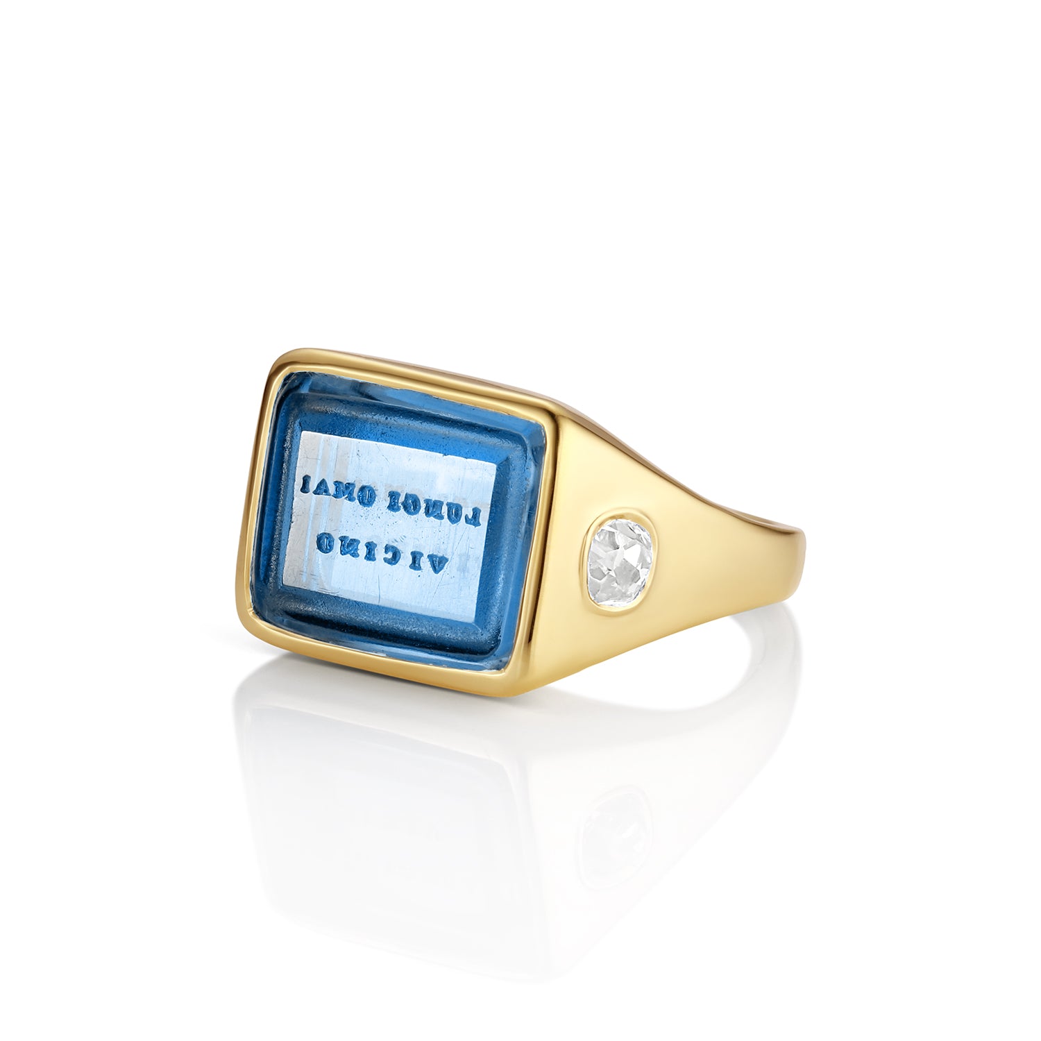 The seal is cradled in hand-crafted, high polished 18k yellow gold, following the clean lines and shape of a classic rectangular signet style ring, that has long symbolized one's heritage and authenticity. Flanking this luminous centerpiece are two sparkling antique Old Mine Cut diamonds (.53ctw), their glittering, romantic glow a testament to their age and character. Each element speaks to a different era, yet together they compose a singular narrative: a ring for those who understand that true closeness knows no distance.